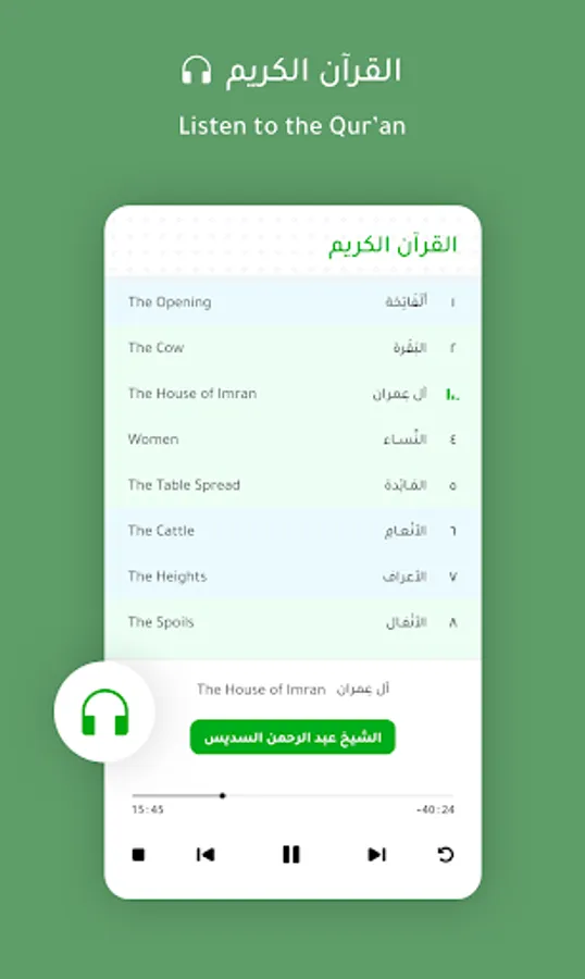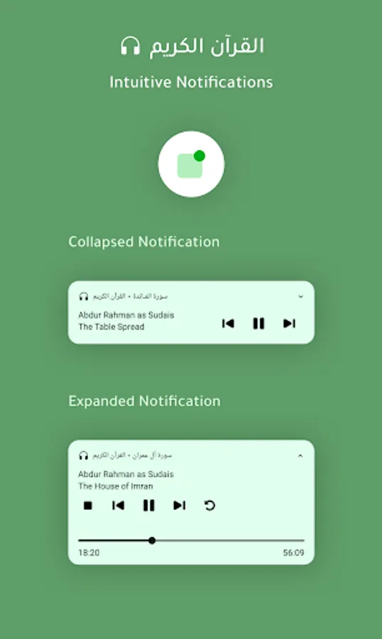 The app has an intuitive UI designed for the best listening experience of the Qur'an. We are trying to make this application as intuitive and user friendly as possible. Please provide any suggestions on improvement and we would be delighted to integrate your feedback into our application. More features are coming soon ان شاء الله.
