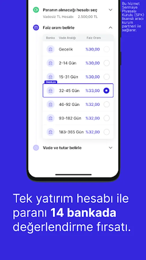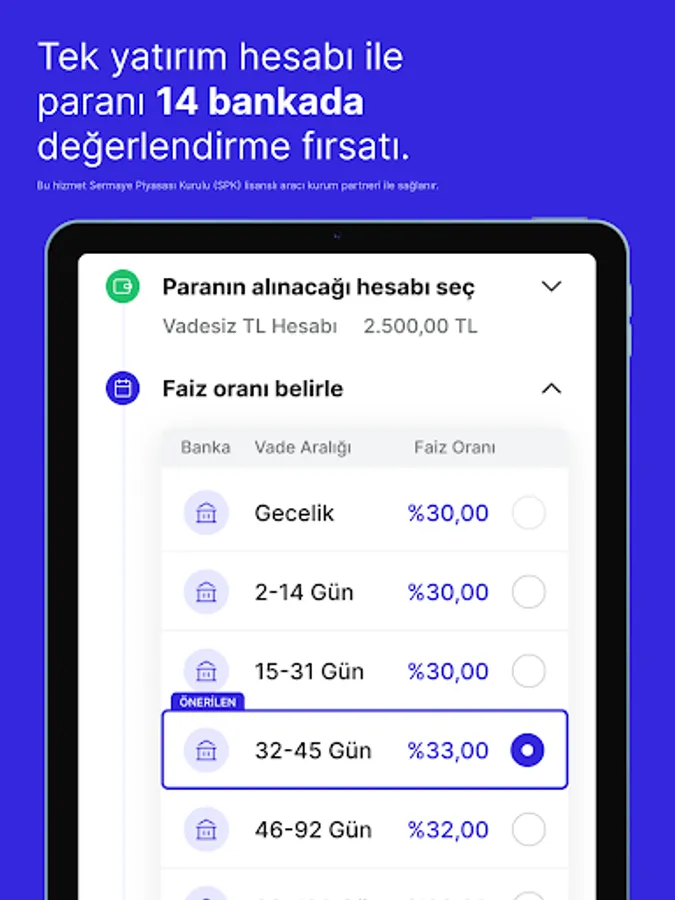 - With a single account, you can benefit from the best interest rates found by our brokerage house partner by getting offers from more than 10 banks. This way, you evaluate your balance with the rates of return offered to big investors, regardless of size.