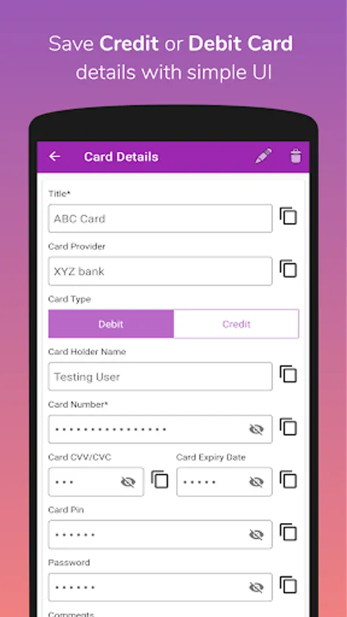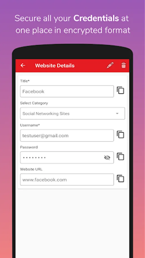 Here is the solution, PASSWORD SECURE keeps every kind of credentials in your phone memory itself completely OFFLINE. With this app you can save Credit or Debit card details, various accounts' username, password, all kinds of custom details, confidential images and documents are just on click away.