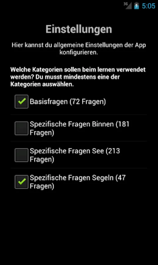 You can decide for yourself which questionnaire you would like to learn. If you only study for the recreational boat license, the other categories can be hidden.