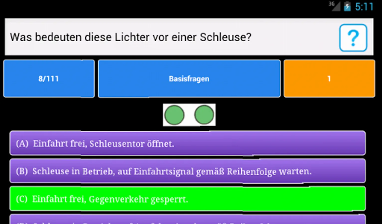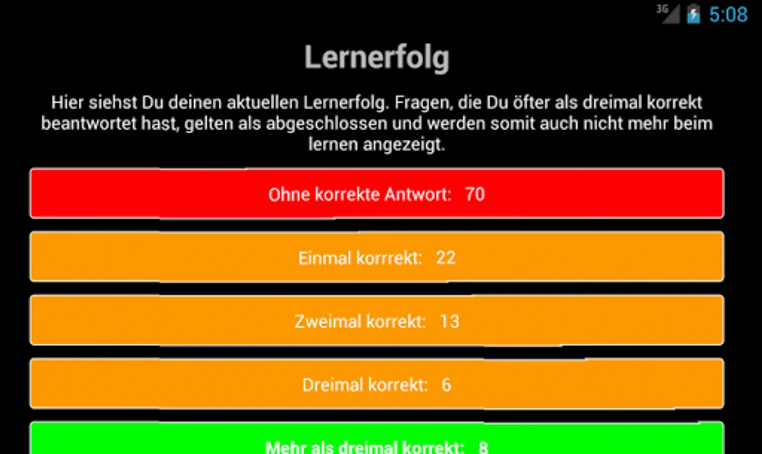 The personal learning success can be controlled any time. It matters that you have not answered correctly are marked in red, the questions have been answered correctly once to three times orange and questions you have answered at least four times correctly displayed in green.