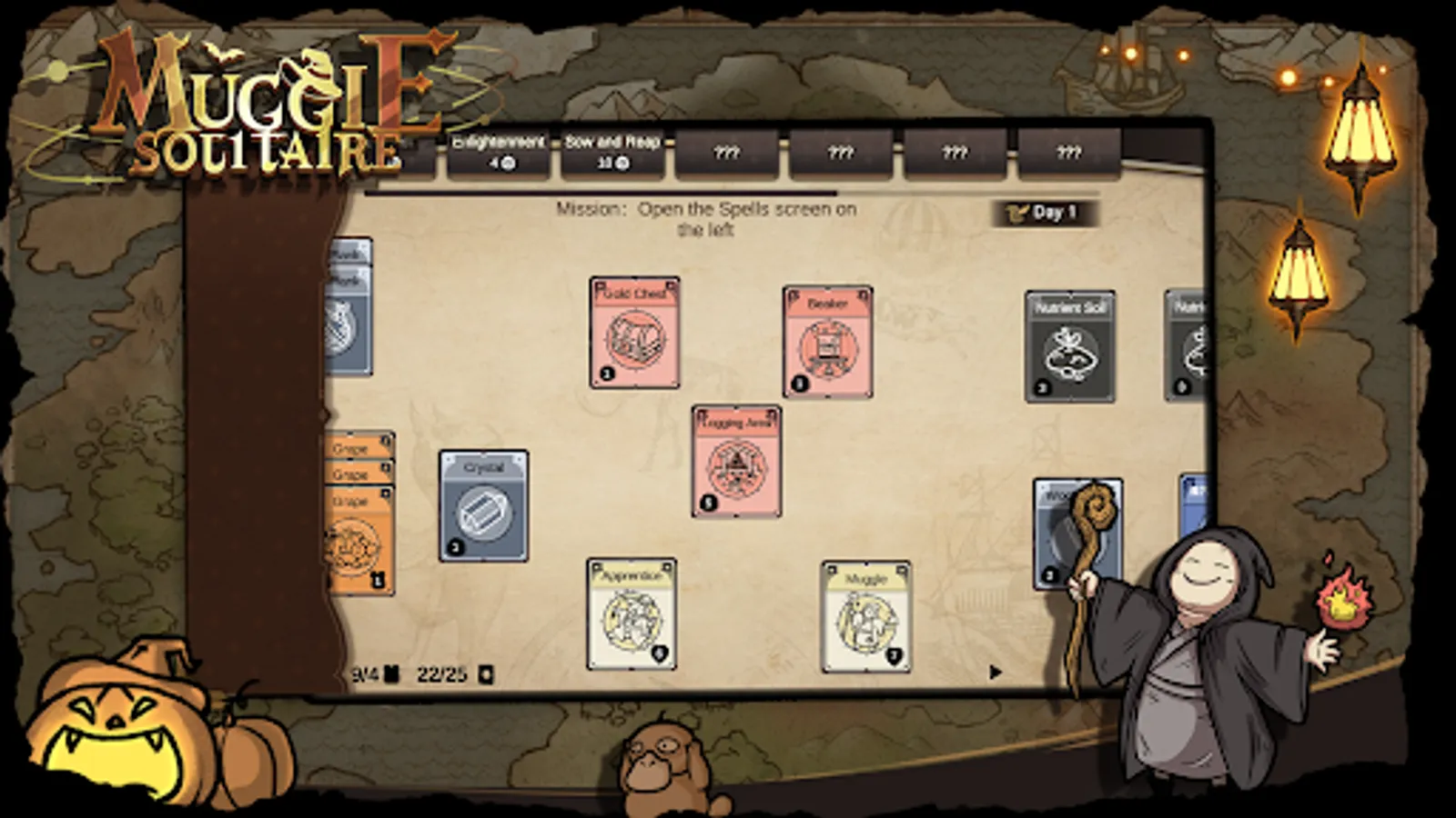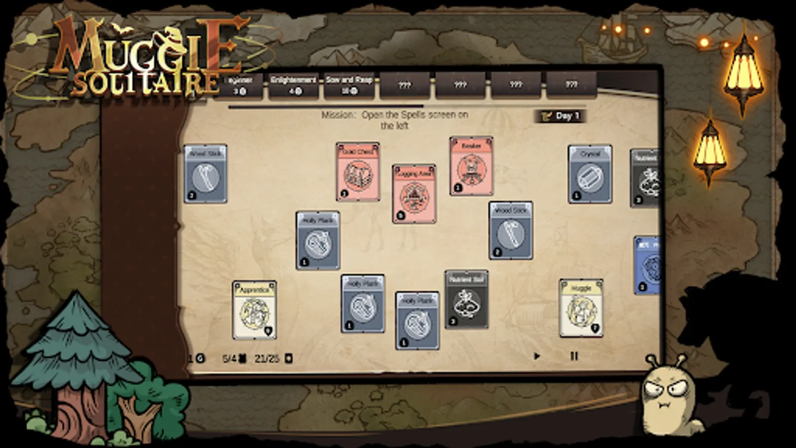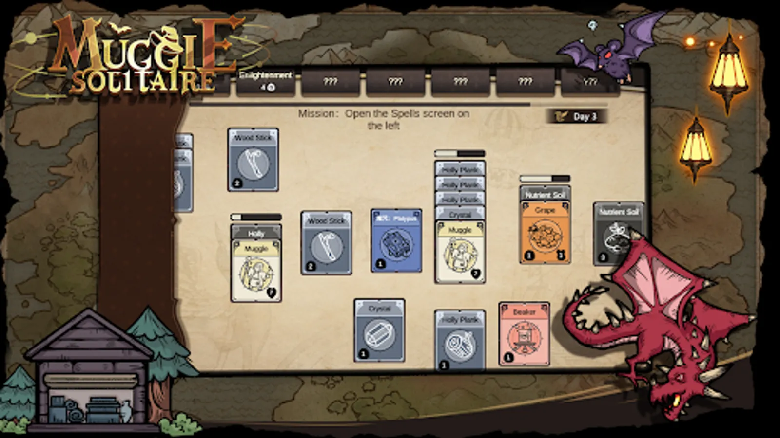 The game also has a battle mode. Whenever a Forbidden Forest card appears, it means that various evil creatures (witches, werewolves, vampire bats, dragons, etc.) are about to appear. You will need to organize your villagers and pick up weapons.