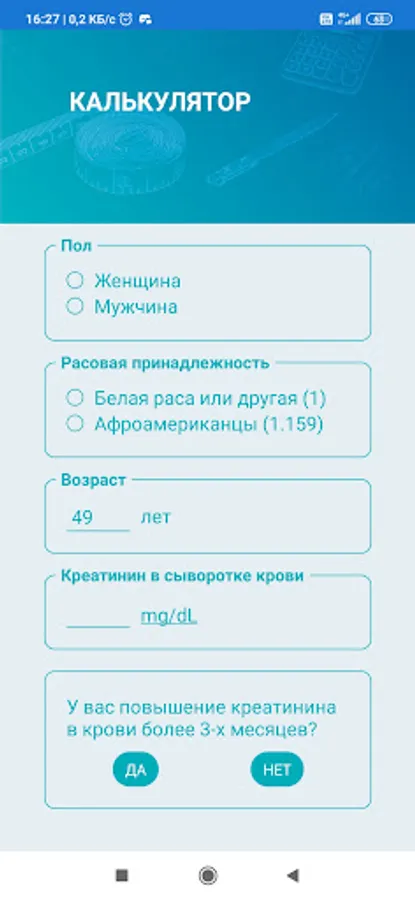 "CALCULATOR": By introducing serum creatinine levels (mg/dL or µmol/L) you can figure the eGFR. Put attention on clarified question below with YES/NO answer (if you answers is "NO", the system issues only eGFR and recommends you to contact a nephrologist nearby; if your answer is "YES", then the system, in addition to GFR, will also gives you a stage of CKD).