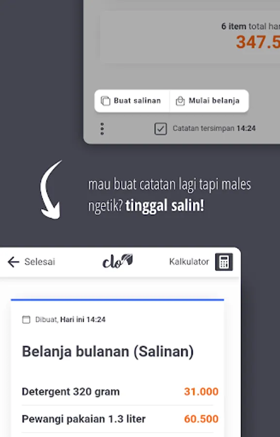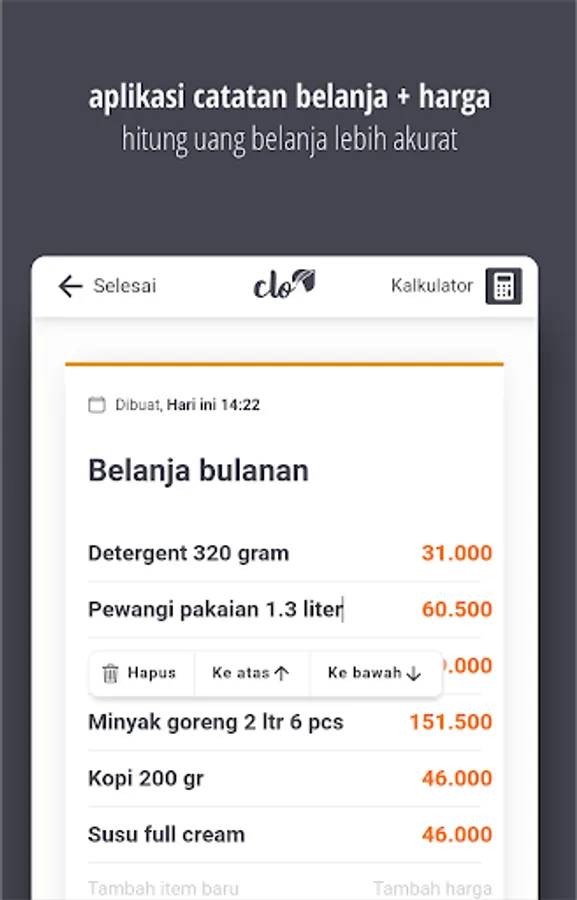 Forgetfulness is a trait inherent in every bapack-bapack when shopping, whether lazy or senile. CLO helps to realize all the items you need to buy with a neat estimate of the price.