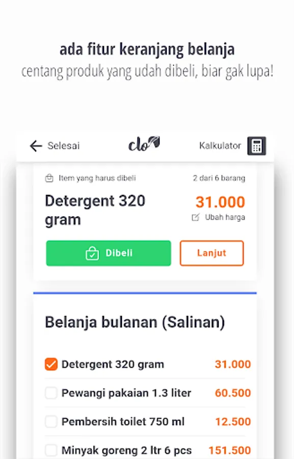Regular monthly shopping is a hassle, there are many things that need to be purchased. The habit of mothers and daughters likes to buy items that are important but sometimes they don't really need it, which ultimately makes the shopping budget excess. CLO helps to ensure that the total expenditure does not exceed the budget.