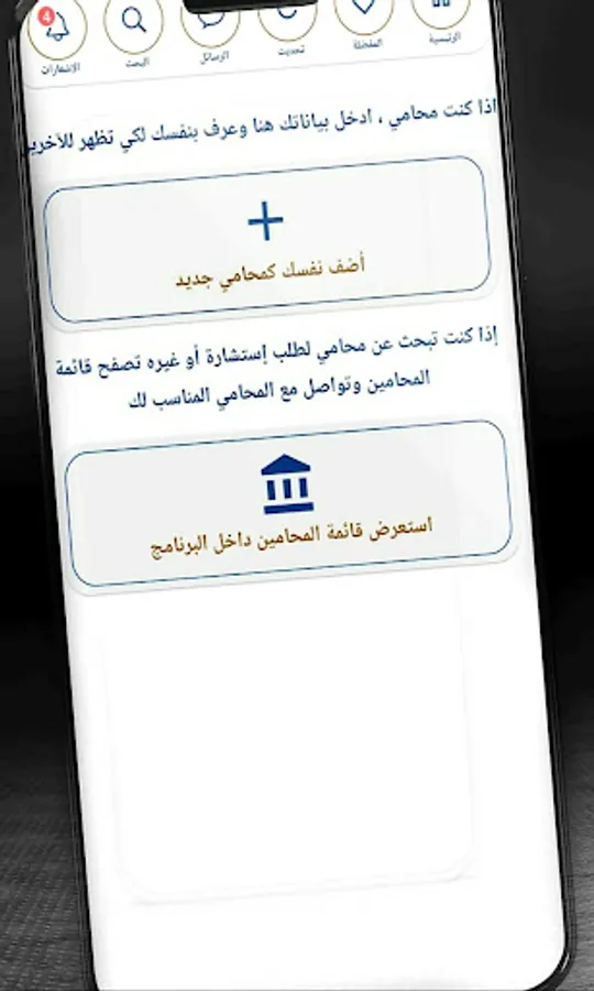 This section is dedicated to law firms and the individual lawyer alike, where the lawyer is allowed to add his legal data and receive legal advice from visitors to the application looking for a lawyer and allow him to choose the appropriate lawyer for them.