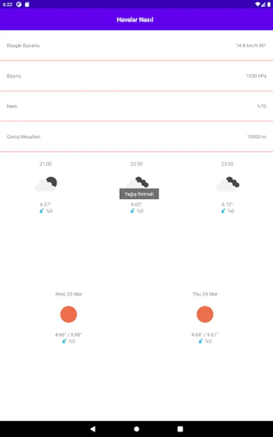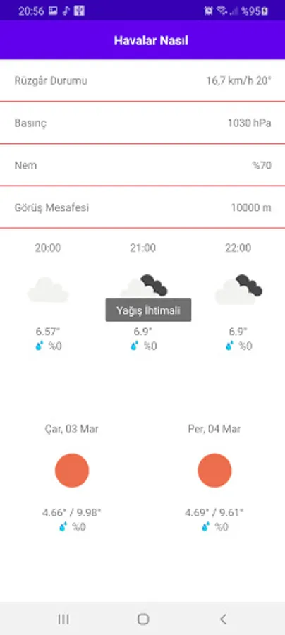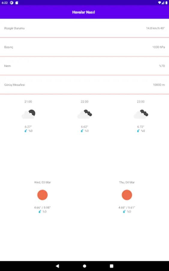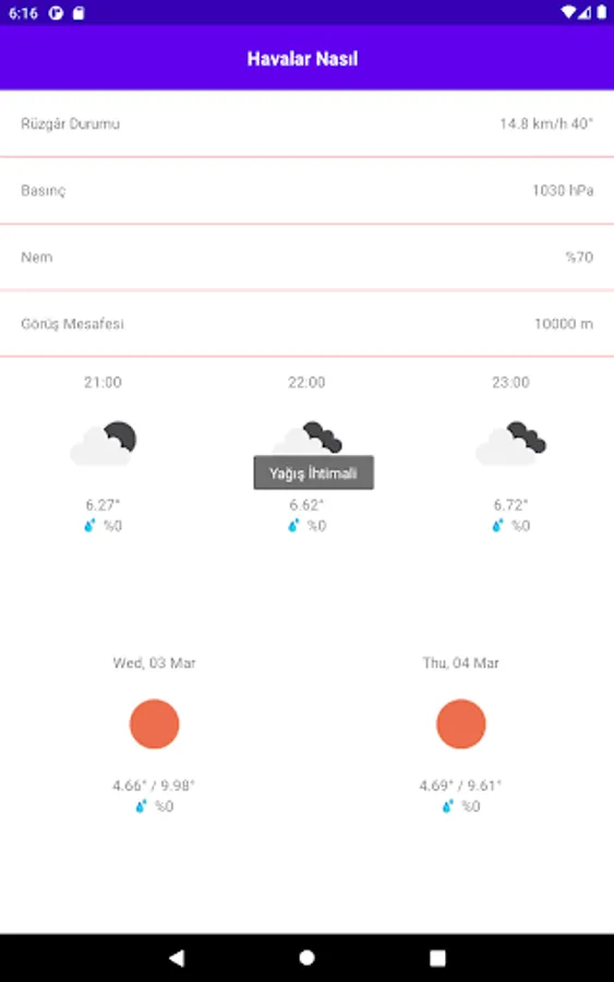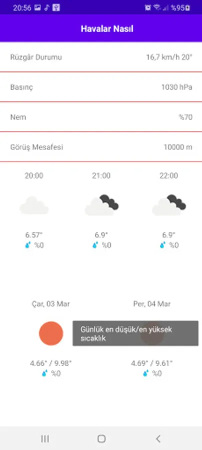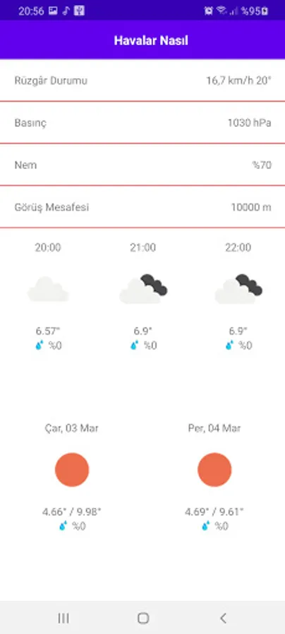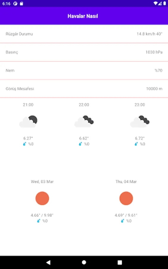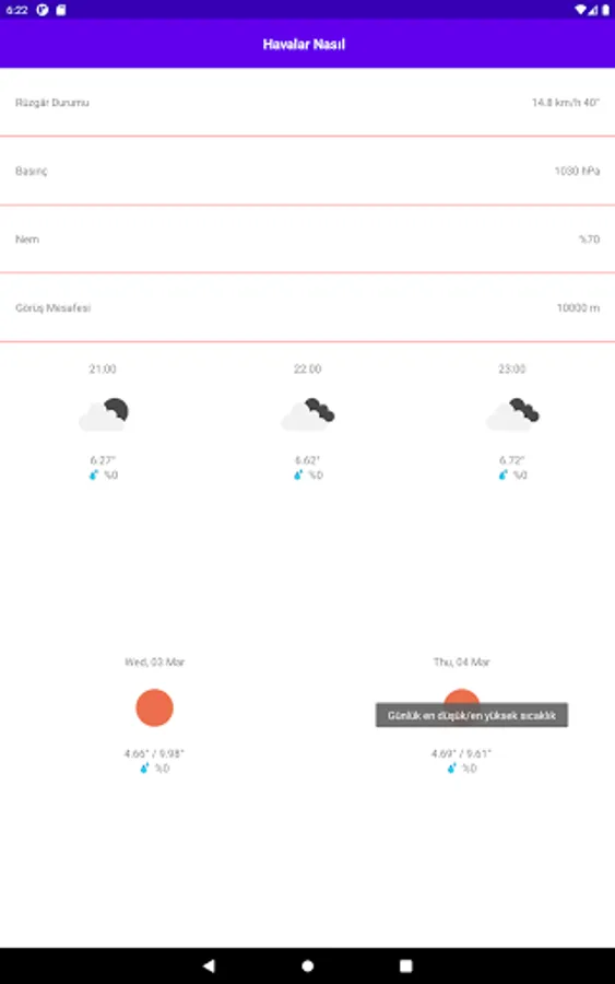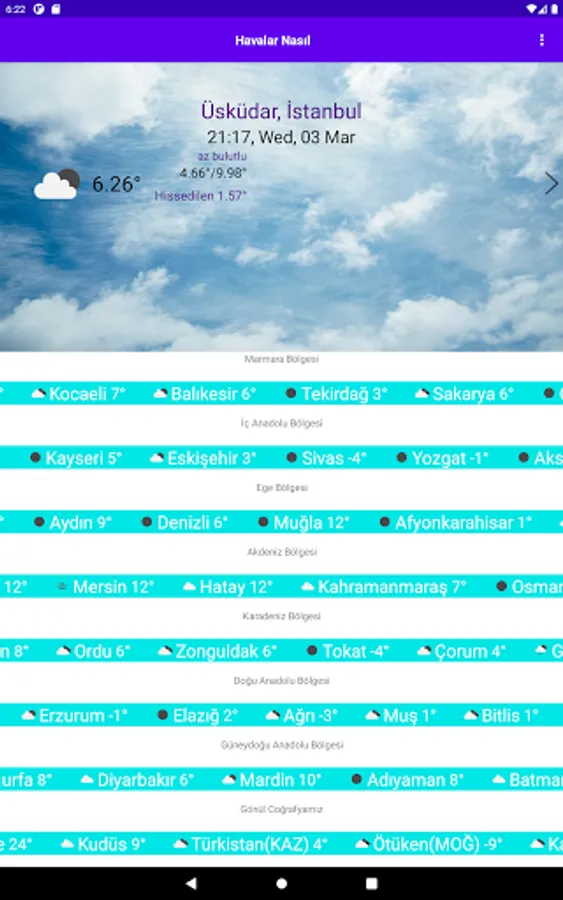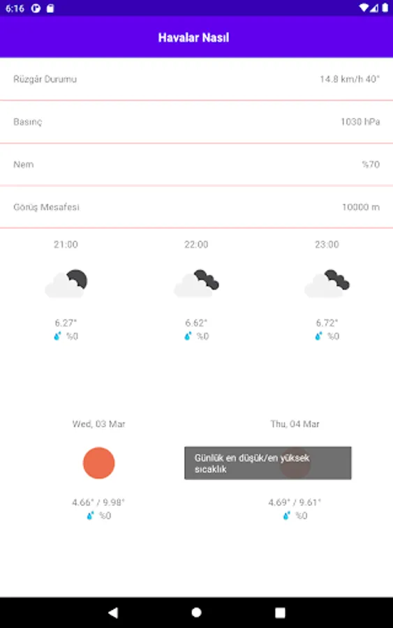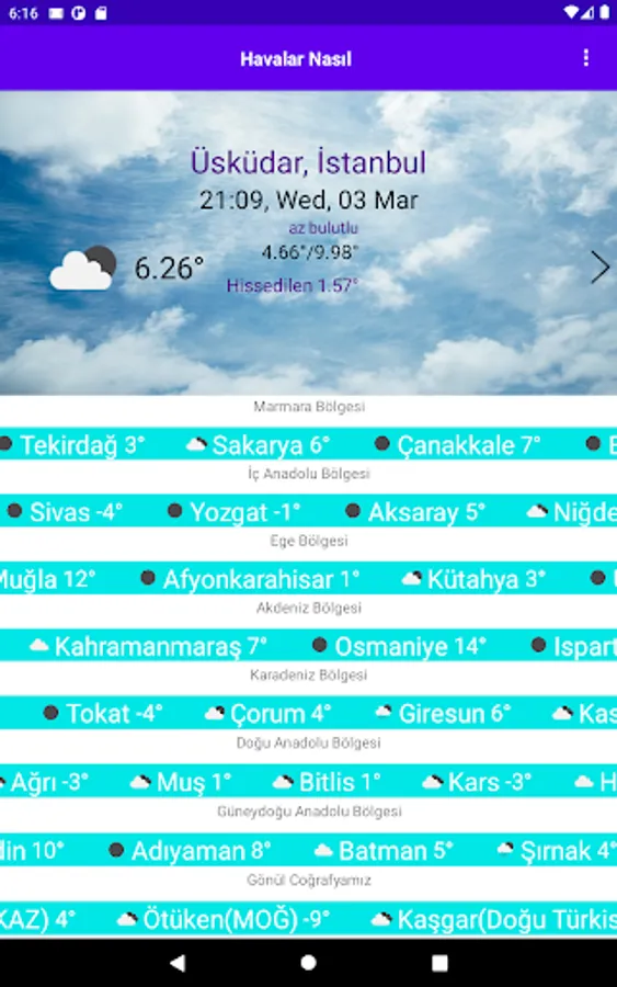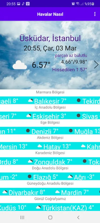 We've grouped the data in certain cities outside of our country and in the whole of Turkey as a regional Finally applications. The forecast data of the location you choose and the current weather data of other cities are periodically updated in case of internet connection. Weather data is provided by https://openweathermap.org.
