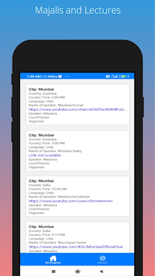 Showing listings of majaalis or lecture including country city time channel and organizer