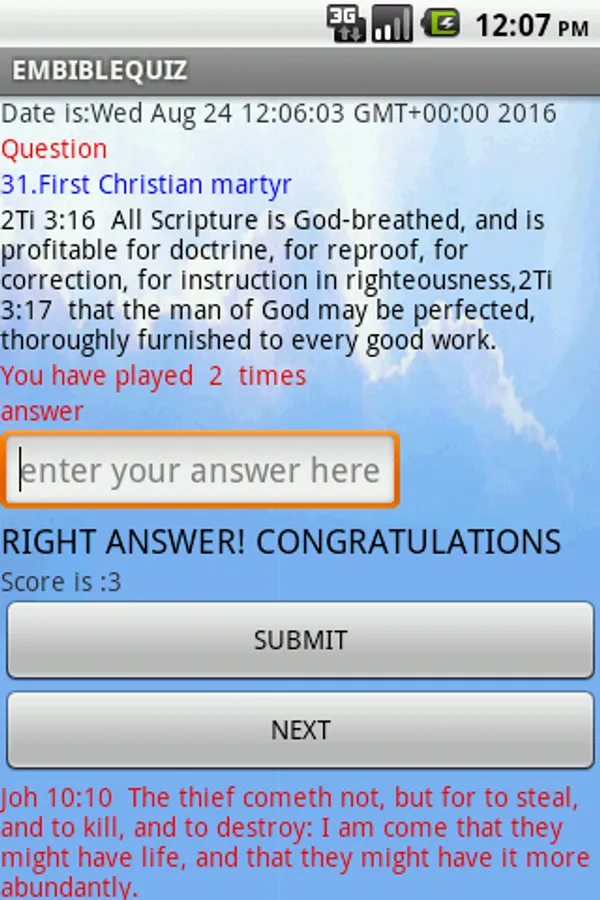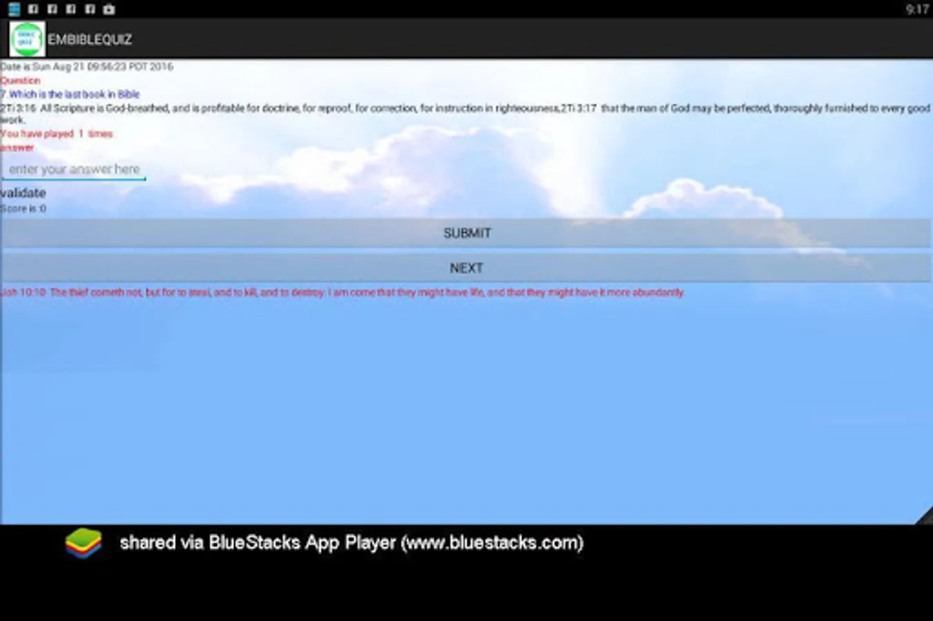 The EMBIBLEQUIZ app randomly generates biblical questions and every question attempted is verified and you receive a score. the NEXT button generates another question and increases times played by one(1). The app presents Bible Study in a game form that is interesting, user friendly and time saving