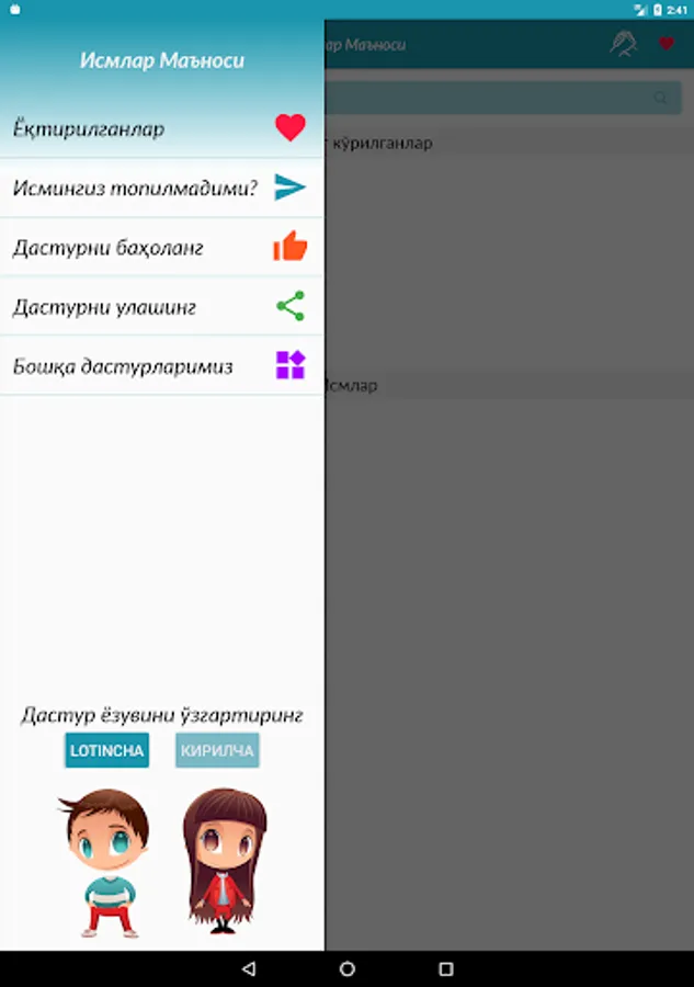 Ўзингиз ва оила аҳилларингизнинг исмлари маъносини билиш энди яна ҳам осон. Дастур энг тўлиқ ўзбек исмлари маъноларини ўз ичига олади. Дастурда 17000 дан зиёд исмлар маъноларини топасиз.