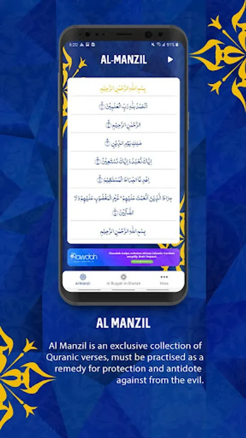 Al-Manzil is a collection of various Quranic verses and Surah, which are significant for Protection and Health of the reciter. It is recited as mean of Protection from all the Evils. The selected verses work as effective cure and protection from Sorcery, Evil-doers, Jealousy and various other factors. The reading of Ruqyah daily is said to be an antidote from the evil.