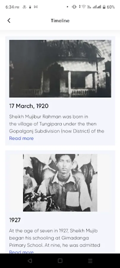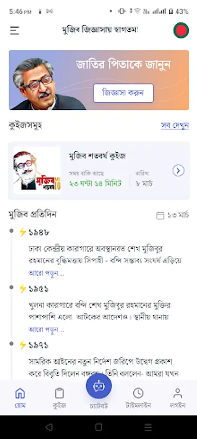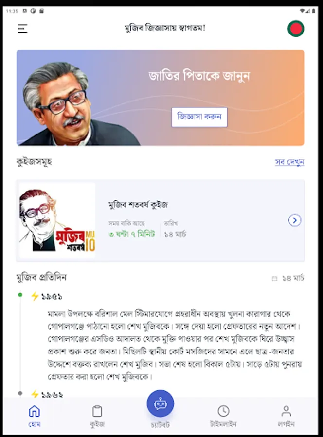 Our app also includes the Mujib Daily and Timeline sections, which allow users to learn about Bangabandhu's life and achievements across different periods of time.