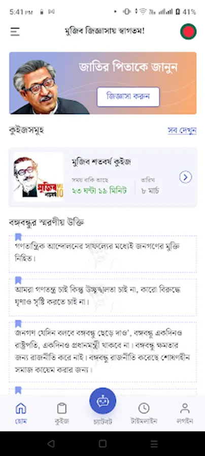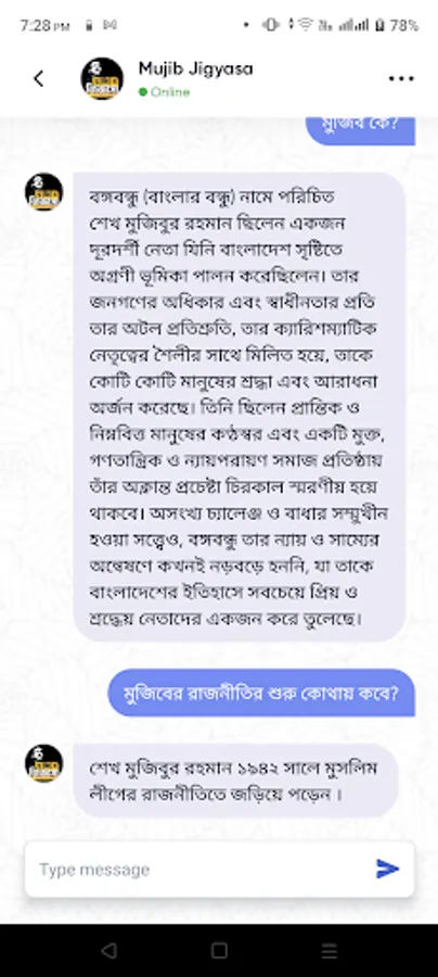 With our app, users can ask our chatbot any question about Bangabandhu and receive accurate and detailed answers. Additionally, upon logging in, users can play quizzes and access a wealth of information about Bangabandhu and the history of the nation.