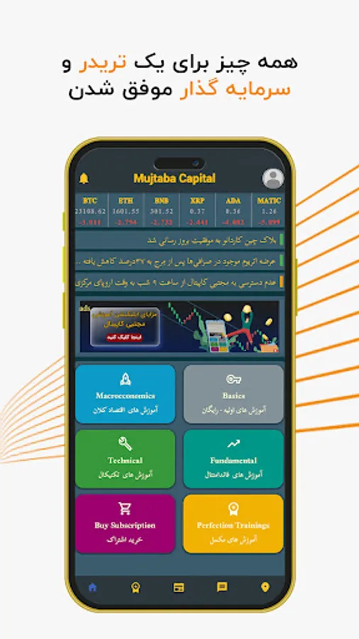 در اپلیکیشن مجتبی کاپیتال شما به بهترین شکل ممکن به معلومات دقیق بازارهای مالی بخصوص ارزهای دیجیتال دسترسی خواهید داشت.امروزه ورود به بازارهای مالی بسیار ساده تر از گذشته است و این میتواند خطری باشد برای کسانیکه بدون آموزش وارد بازار میشوند.