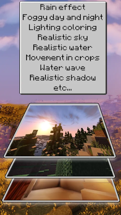 The new shaders for minecraft (MCPE) will add many features to your world that will make realistic graphics, improve performance, improve graphics, allow 4k texture support, and allow you to process the texture packs game better. These mods will improve the look of the world in realistic minecraft.