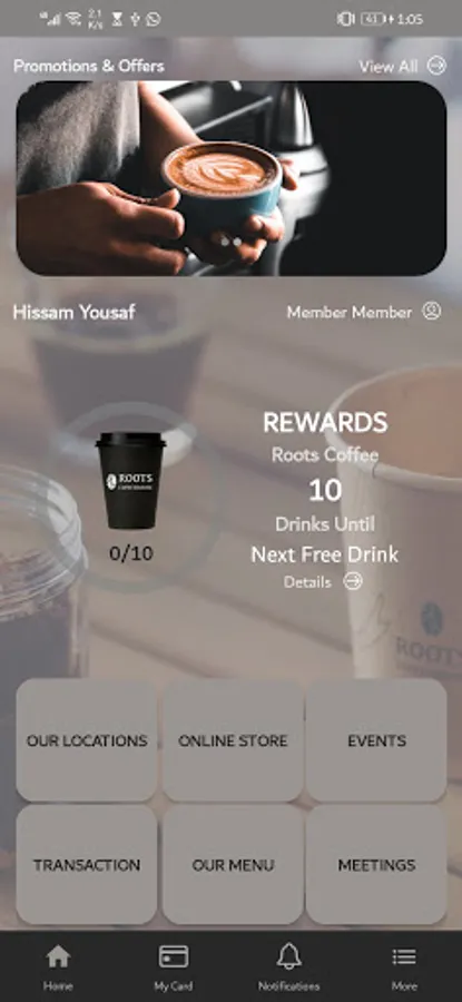 Download the Roots Coffee House Loyalty Program to keep up with the number of points collected, benefits earned, latest promotions and the upcoming events taking place in Roots Coffee House.