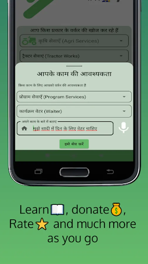 India’s first simple app which help people of rural areas to find workers or work near to them related to Field Farming, Driving, Marriage Programs, Construction Works, Plumbing, Electrical Works, Home Helpers and many more work profiles.
