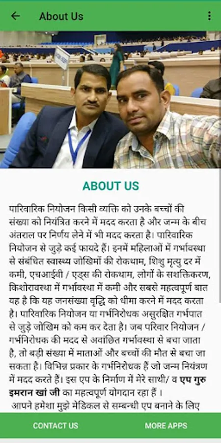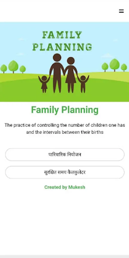 इस एप में हमने पारिवारिक नियोजन से सम्बंधित तरीके व परिवार नियोजन से सम्बन्धित भ्रांति व उनका सही समाधान के बारे में, परिवार नियोजन से सम्बन्धित प्रश्नोत्तरी, पारिवारिक नियोजन से जुड़े कई फायदे के बारे में। इनमें महिलाओं में गर्भावस्था से संबंधित स्वास्थ्य जोखिमों की रोकथाम, शिशु मृत्यु दर में कमी, एचआईवी / एड्स की रोकथाम, लोगों के सशक्तिकरण, किशोरावस्था में गर्भावस्था में कमी और सबसे महत्वपूर्ण बात यह है कि यह जनसंख्या वृद्धि को धीमा करने में मदद करता है।इस एप को हिंदी न अंग्रेजी दोनों भाषाओं में बनाया गया है|