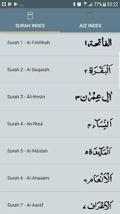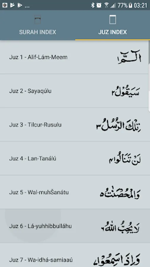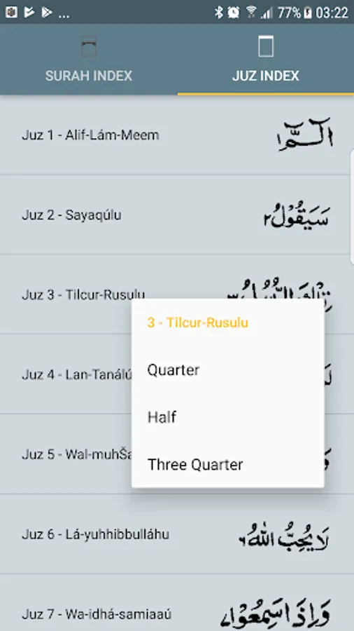 Juz and Surah Index. Press and hold the Juz name to select the desired quarter of the Juz.