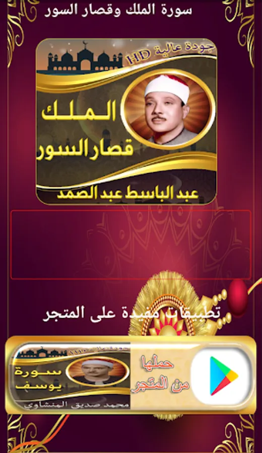 An application that includes humble recitations of Surat Al-Mulk and short chapters by Sheikh Abdul Basit Abdul Samad without the net, with the most beautiful voice and the purest quality of the chapters from the Holy Quran without the Internet.