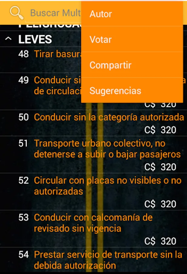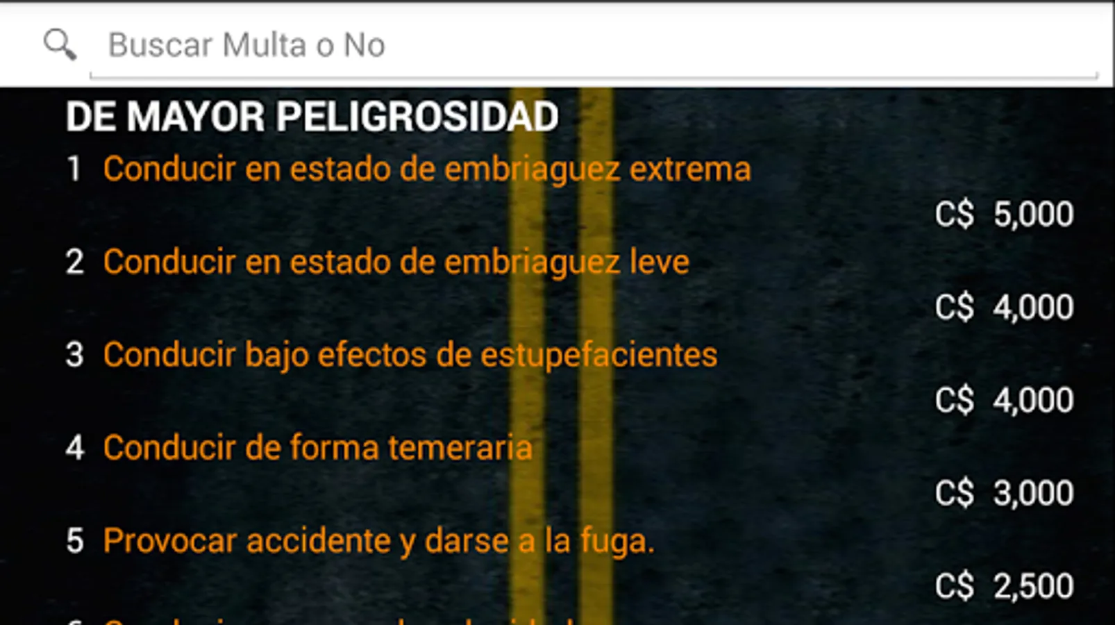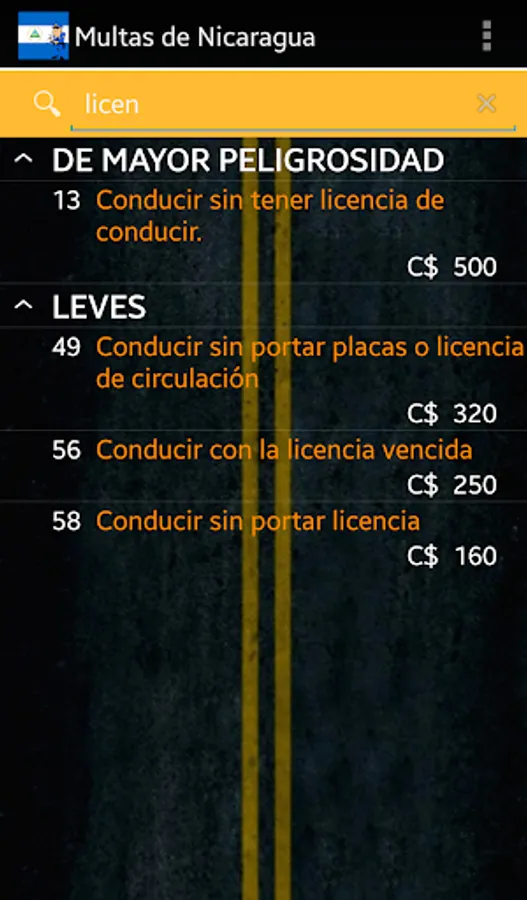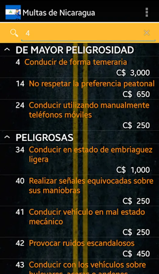 I get the application to consult traffic fines in Nicaragua with their prices according to the law 431, perfect for if we forget the manual or if you're just learning the law. It's time to use this app requires no Internet and is easy to use.
