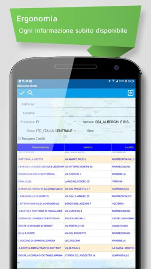 Customer portfolio [Full registry ✦Scheda, ✦Storico sold with economic conditions applied, ✦ Geolocation with multiple selection, direct ✦Avvio of phone functions, email, web and navigation system from the data sheet]