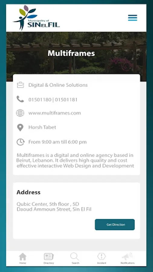In addition to advanced business directory where the user can search for any business in Sin El Fil by category, area, keywords and get direction through Google maps.