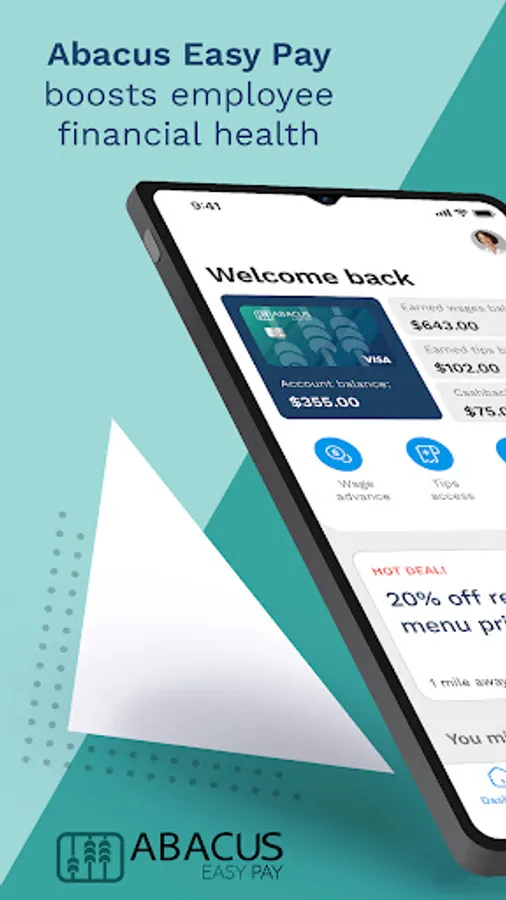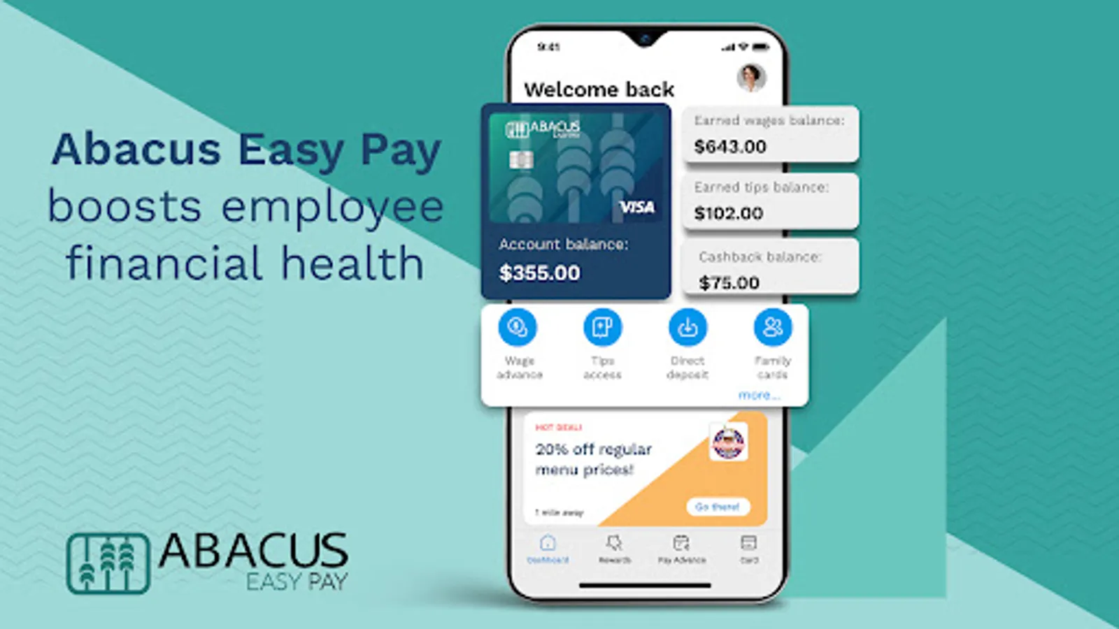 Abacus Easy Pay is an innovative and comprehensive solution oriented to recognize, retain, engage and reward what companies value the most: the financial well-being of their people. We are the one and only digital platform that integrates financial solutions and the most trusted promotions network in America. We provide access to daily wage access and our users obtain the best online deals, cash back and saving opportunities. In simple, easy steps with an amazing user experience our service is at no cost for you or your employee.
