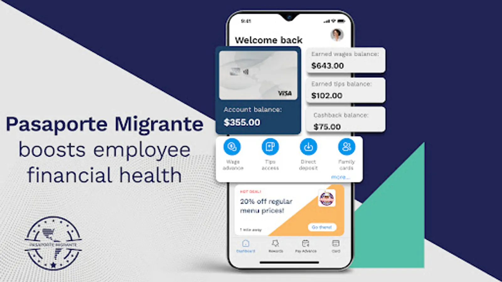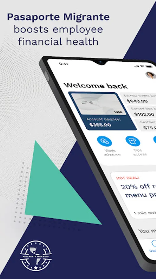 Pasaporte Migrante is an innovative and comprehensive solution oriented to recognize, retain, engage and reward what companies value the most: the financial well-being of their people. We are the one and only digital platform that integrates financial solutions and the most trusted promotions network in America. We provide access to daily wage access and our users obtain the best online deals, cash back and saving opportunities. In simple, easy steps with an amazing user experience our service is at no cost for you or your employee.
