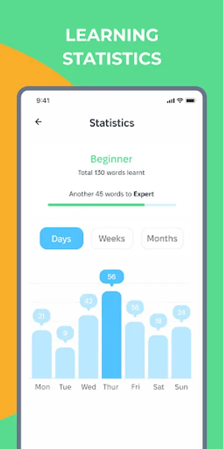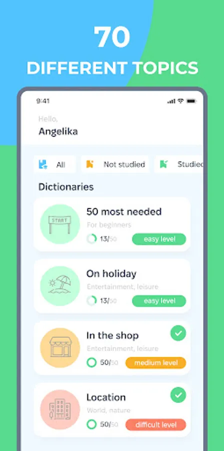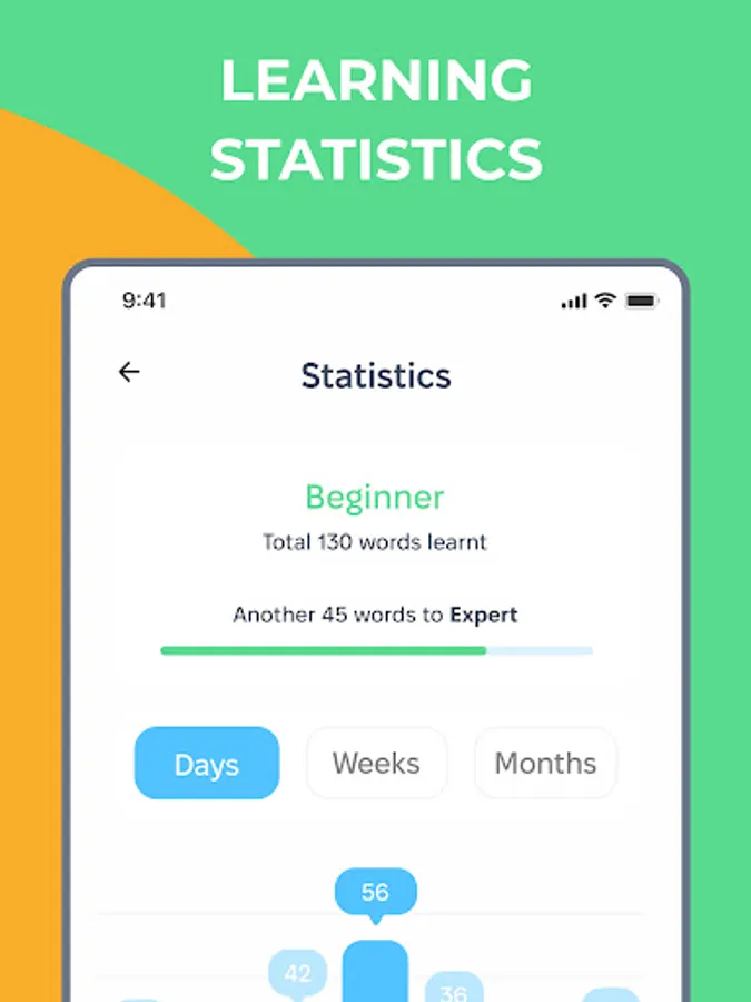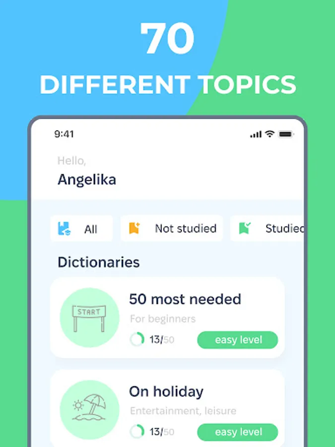 • Personal statistics: You can track your progress and find out which topics or words require extra attention.