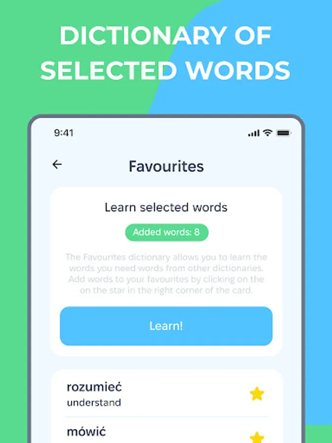 • Different difficulty levels: start learning Polish words from easy to difficult. All words are sorted by difficulty level.