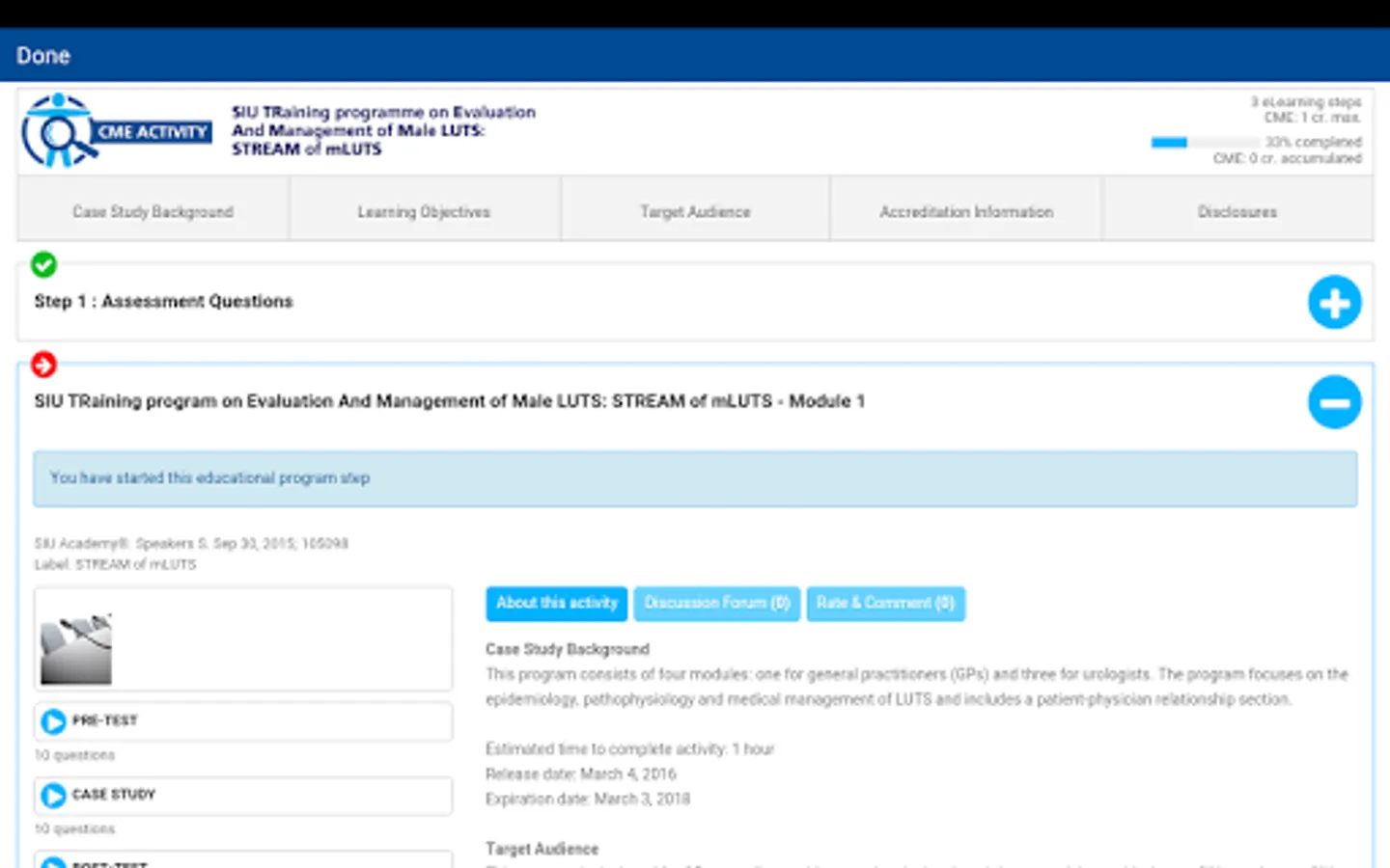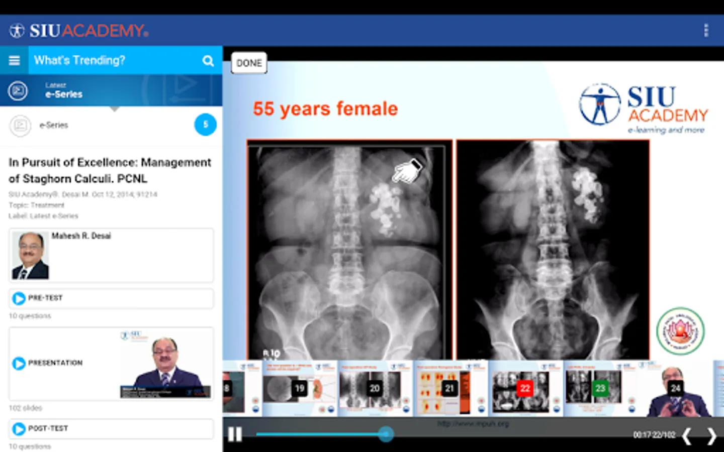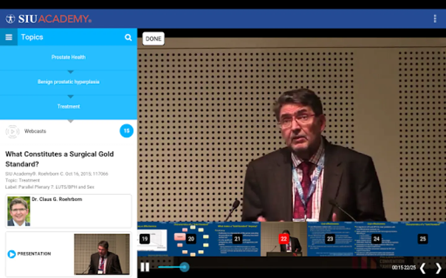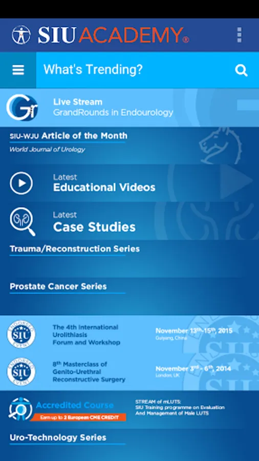 SIU Academy® App, the official mobile learning app of the Société Internationale d’Urologie (SIU), offers access to thousands of educational materials and activities published by SIU over the years such as eLearning Programs, Accredited Lectures, Self-Assessments, Learning Quizzes, Webinars, Asynchronous and live Webcasts, ePosters, Video Techniques, Documents, Abstracts, Expert opinion videos and editorials.