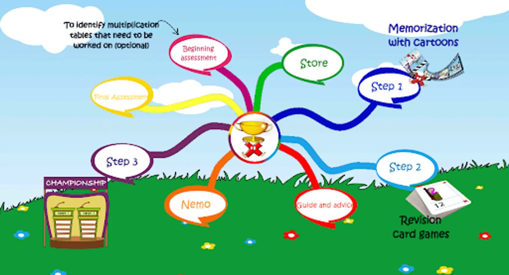 Each times table is animated into a short cartoon. The numbers are actors that will tell funny and exciting stories that your child will remember for the rest of their life! For each multiplication table, your child will have a picture of the answer that will automatically "pop into their head" to find the correct answer. He or she will become the best in their class in less than 15 days (if learning 2-3 new times tables a day.)