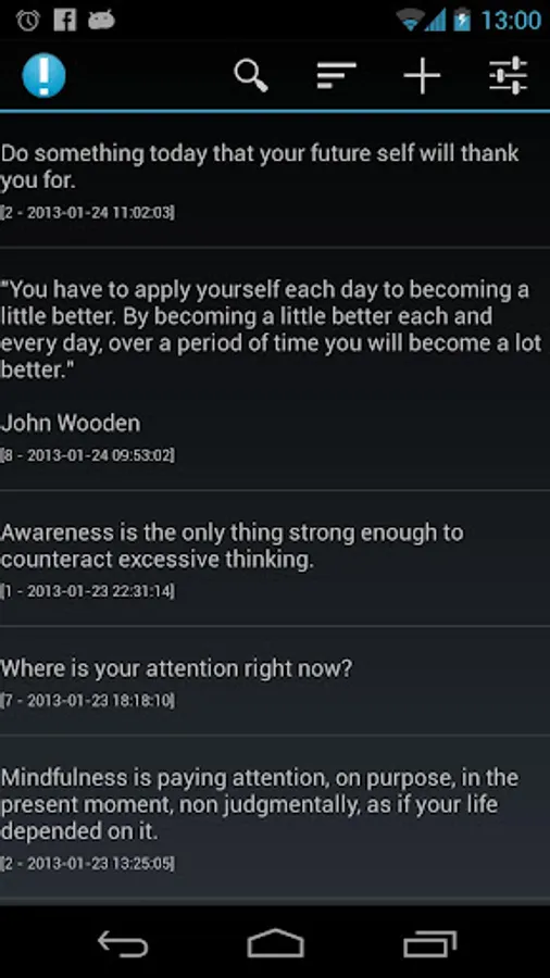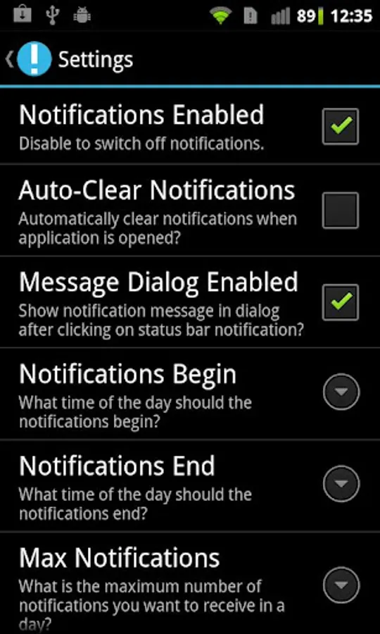 With Nom, instead of a bell, you receive a notification in your status bar. You add phrases to Nom which will motivate you or inspire you. You configure how many notifications you want to receive during the day, the minimum / maximum gap between notifications etc. Nom then picks one of your phrases at random points and displays it as a notification.