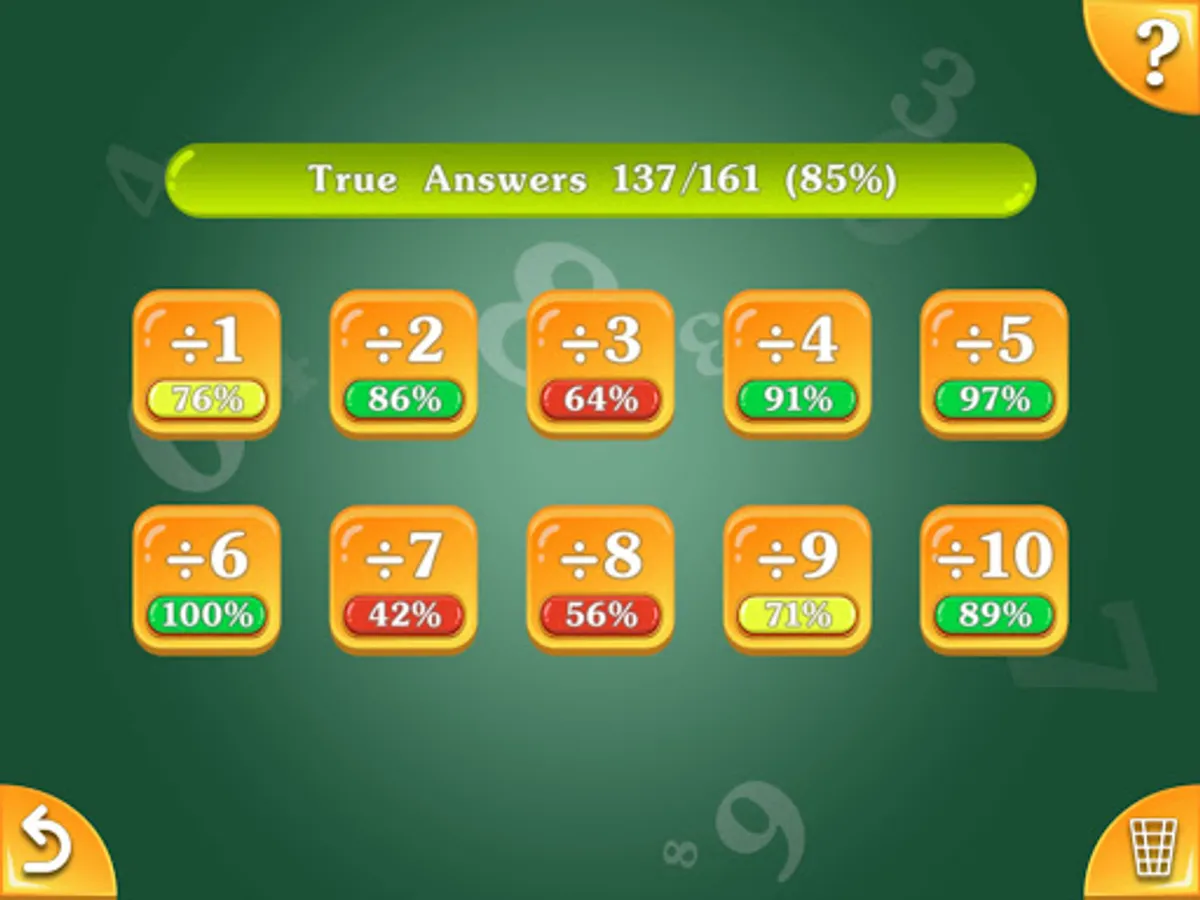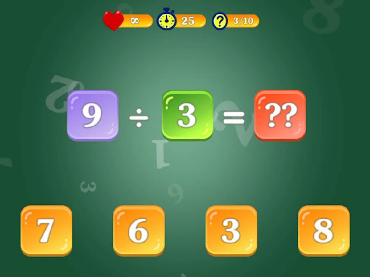 Suitable as a task from an adult child. You choose what numbers will multiply and division, as well as how much time, questions and lives will be at your disposal.