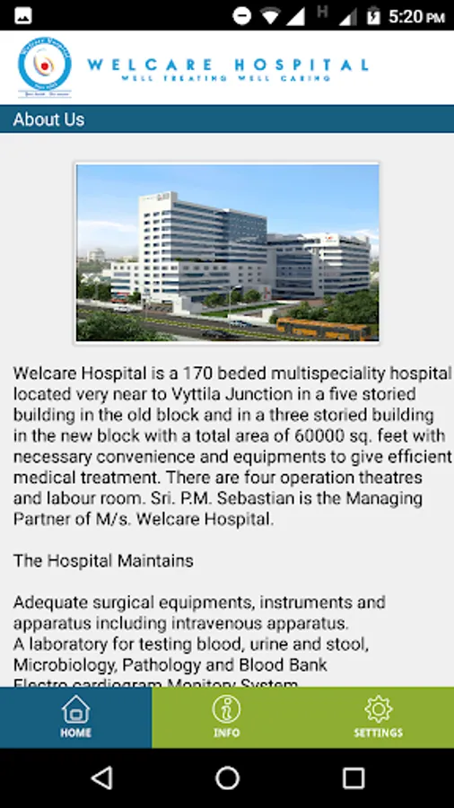 M/s Welcare Hospital is a 170 beded multispeciality hospital located very near to Vyttila Junction in a five storied building in the old block and in a three storied building in the new block with a total area of 60000 sq. feet with necessary convenience and equipments to give efficient medical treatment. There are four operation theatres and labour room. Sri. P.M. Sebastian is the Managing Partner of M/s. Welcare Hospital.
