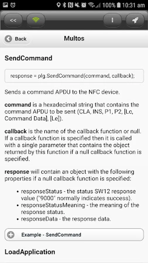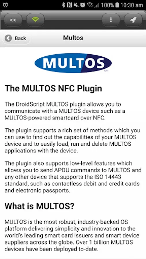 This DroidScript MULTOS plugin allows you to communicate with a MULTOS device such as a MULTOS-powered smartcard over NFC.