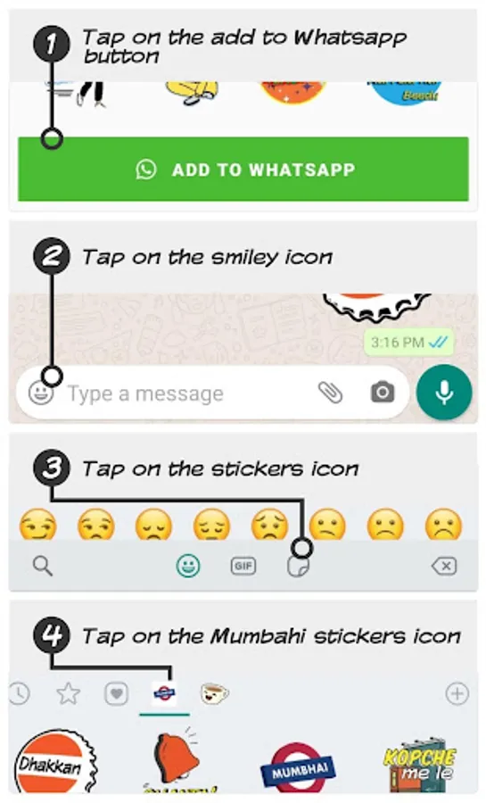 4. In WhatApp, open a chat conversation. Tap on the smiley face, then Tap on the sticker icon at the bottom to see and use Mumbhai Stickers