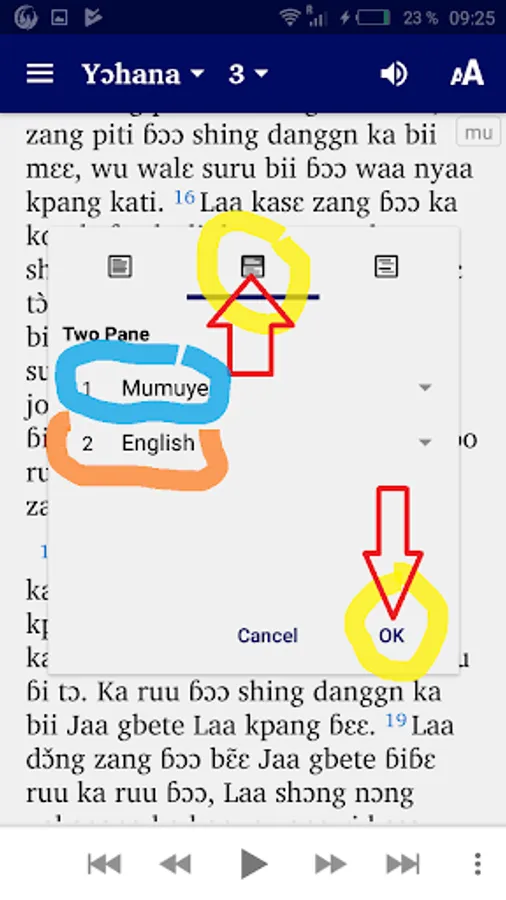 - "two panes" to display the Mumuye at the top and the English version at the bottom