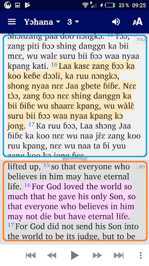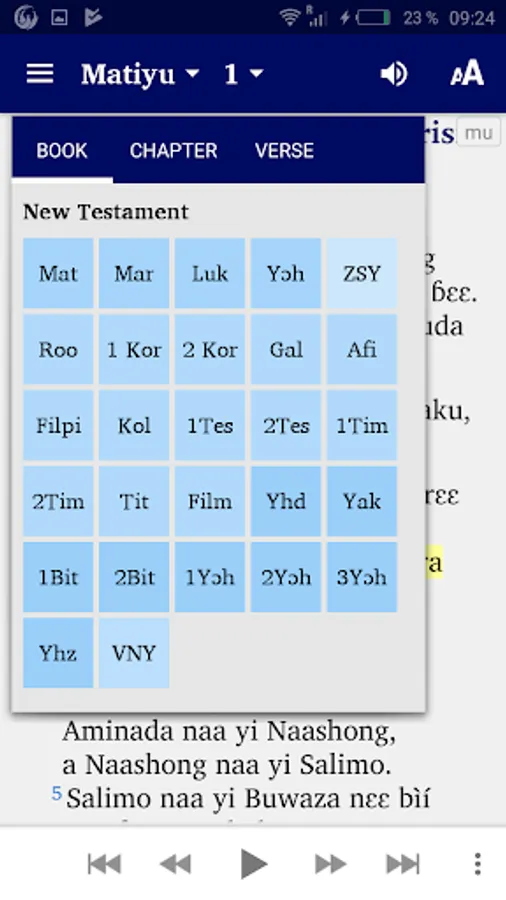 - "verse by verse" to display a verse in Mumuye followed by the same verse in English.
