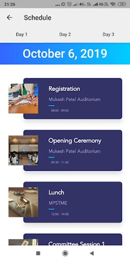 Schedule gives the participants the information about the timings and the venue of the schedule throughout the day. It includes Registration, Opening Ceremony, Lunch, Committee Session 1, High Tea, Committee Session 2, and informal events.