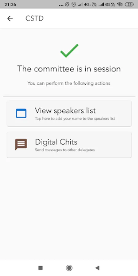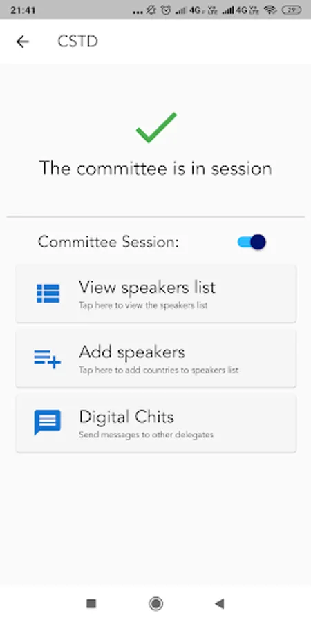 Committee Session includes information about the Speakers List and replaces the passing of physical chits. Here, the participants can add their names to the speaker’s list and the EB is able to view this information. Participants can communicate with each other in the ‘Digital Chits’ section. The EB also controls whether the committee is in session or not in session.