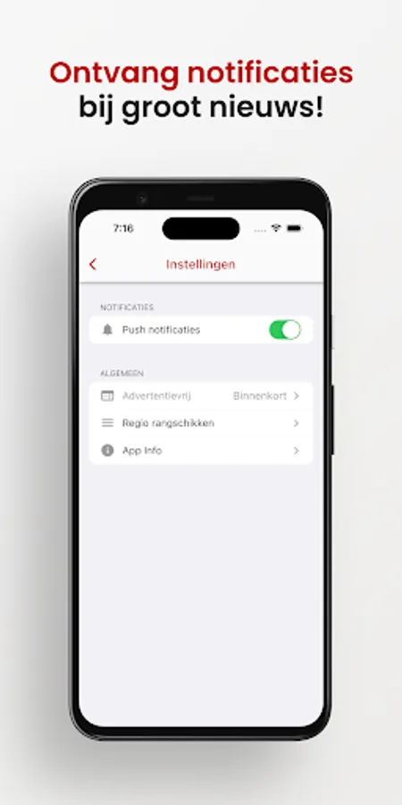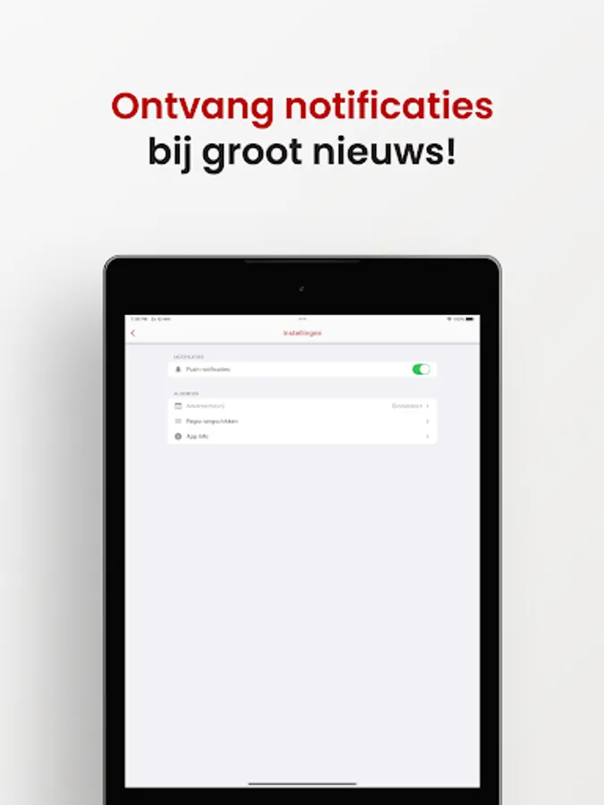 In the 'Settings' menu you can indicate whether you want to receive a push message. In the event of important events, we will send a push message so that you are immediately informed of the event.