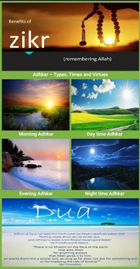 - Adhkar of day, night, morning, evening and after prayer(all separate)