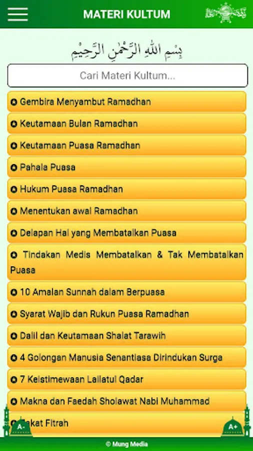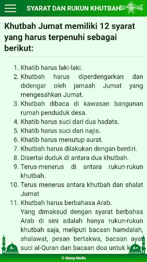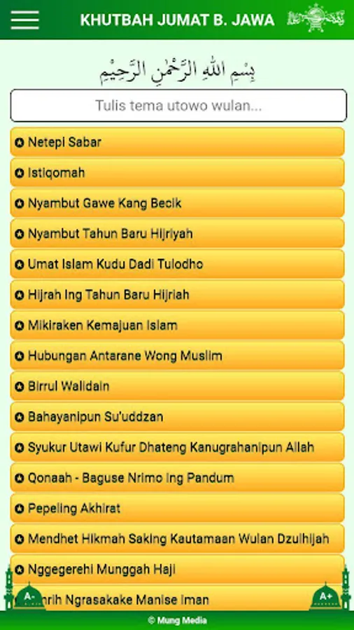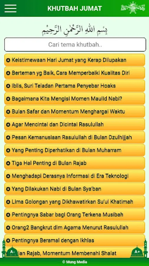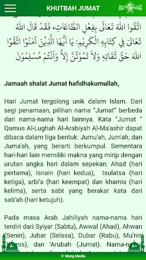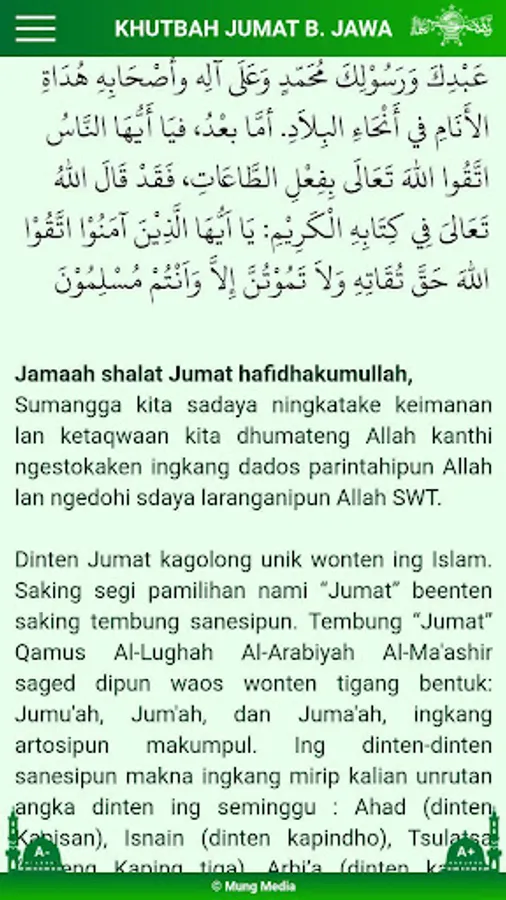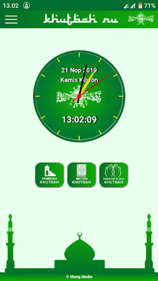 The NU FRIDAY KHUTBAH application was developed by Mung Media. This application is expected to make it easier for Muslims, especially the preachers, in delivering sermon material. Hopefully this application can make it easier for preachers to choose collections of sermon material with various themes that are in accordance with current conditions.