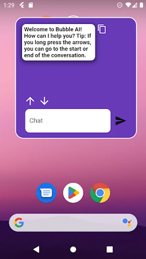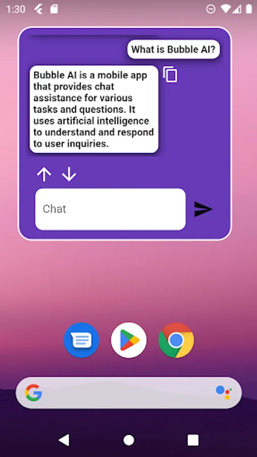 Say hello to Bubble AI! 🌟🗨️. Just a tap away, it opens an AI chat, allowing you to seamlessly interact with our intelligent virtual assistant, without leaving your current app. 💬💡 Get quick answers and tap into the limitless possibilities of GPT-powered intelligence. 💪💭 Experience a new level of efficiency and stay in the flow with Bubble AI - your go-to AI companion for every app! 🚀📱