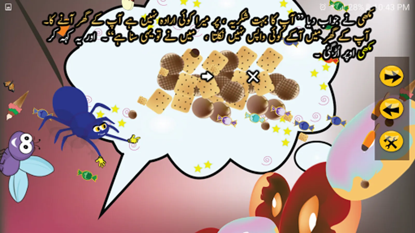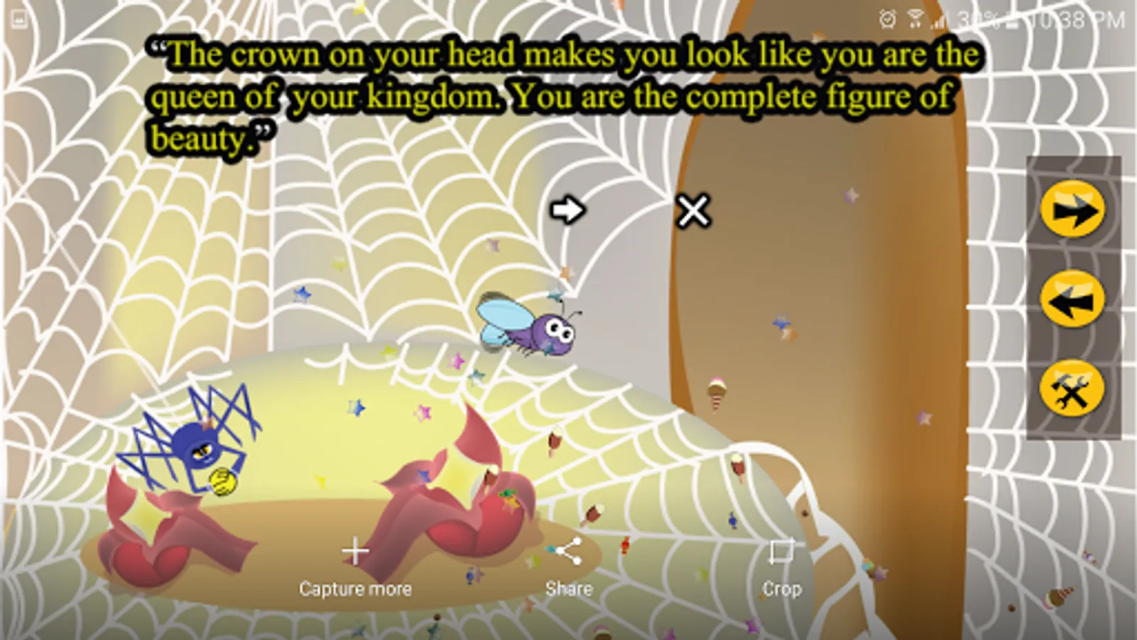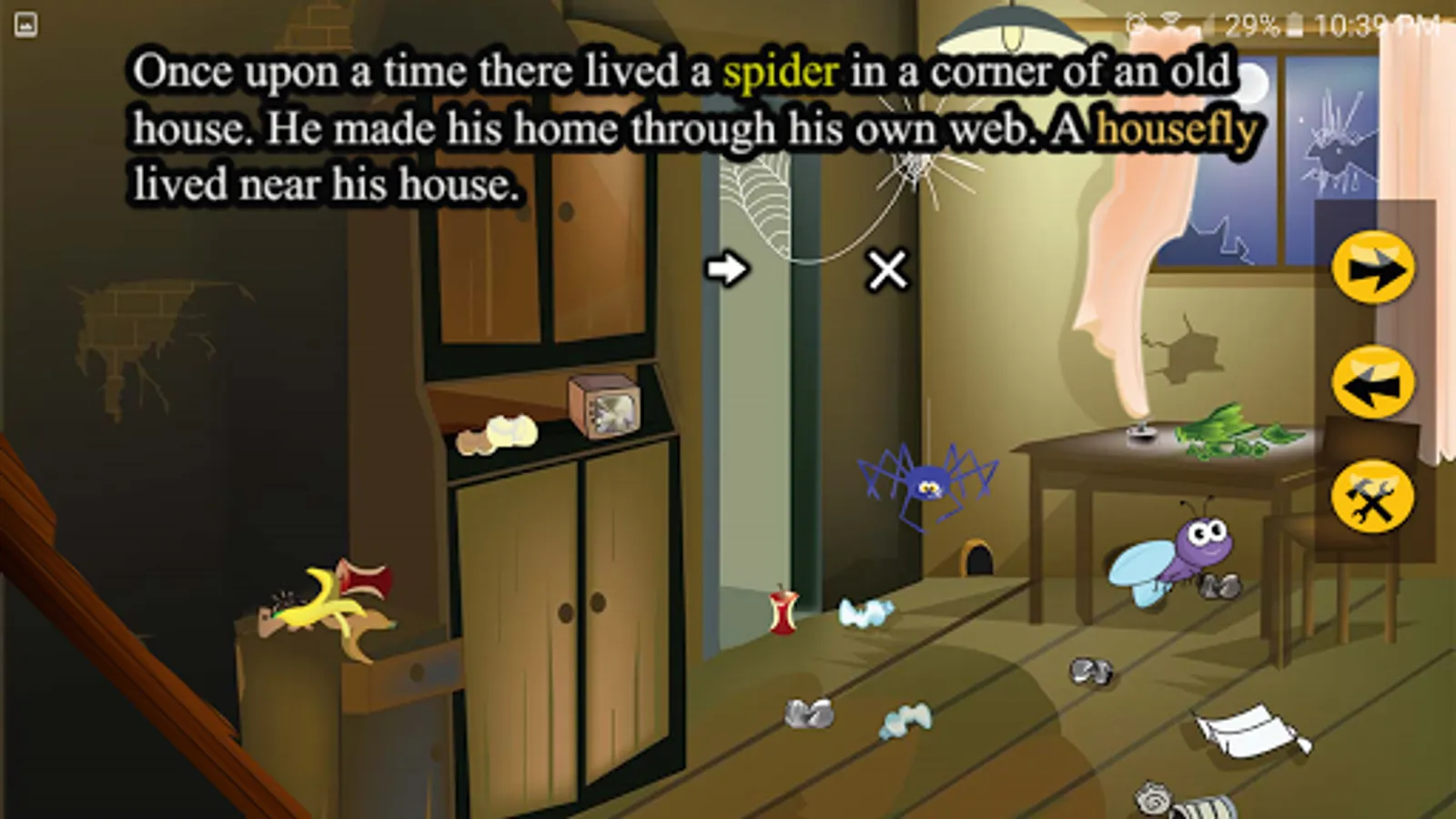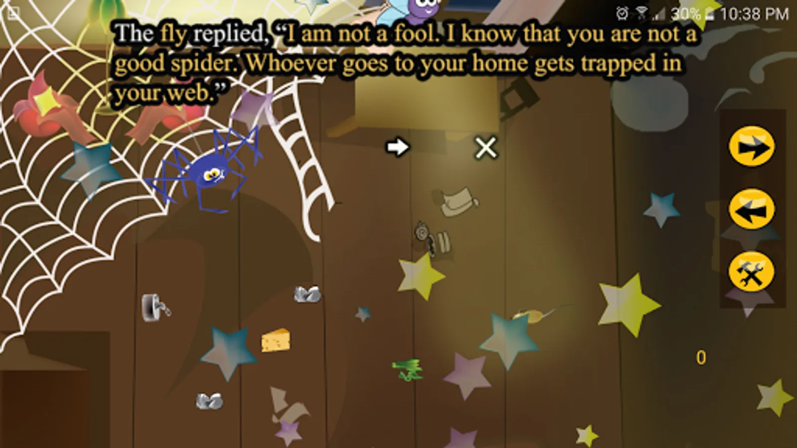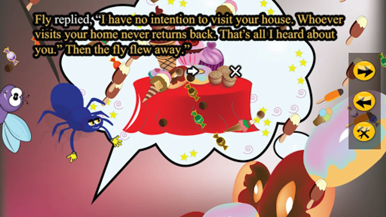 If ever there were a story for children with a terrible warning, it is this. The app depicts the conversation between a fly and a spider, where spider intention is to catch her with his fake praises.