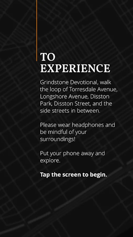 Grindstone Devotiona is an interactive soundwalk of Philadelphia's Tacony neighborhood created by The Mural and The Mint, with members of the community. Go to Torresdale Avenue between Longshore Avenue and Disston Street, launch the app, put on your headphones, put your phone away and start walking the blocks between Longshore and Disston to the park. Each part of the journey has its own distinctive experience. You must be in the appropriate place to experience this app. Continued use of GPS running in the background can dramatically decrease battery life.