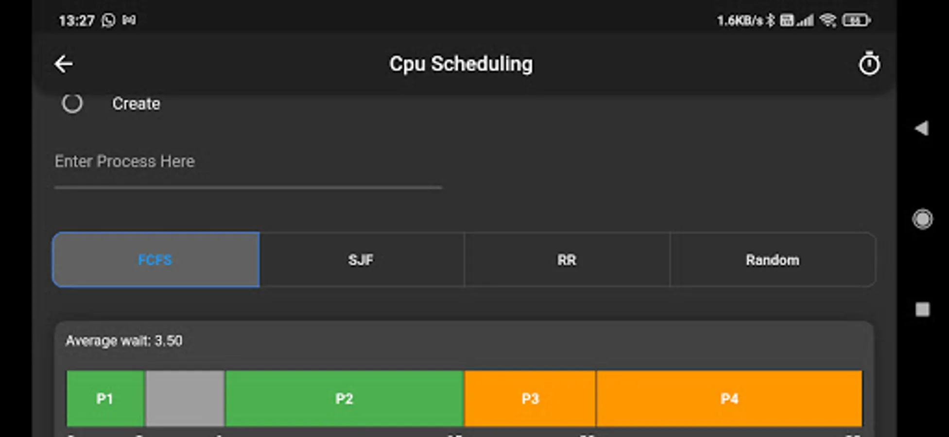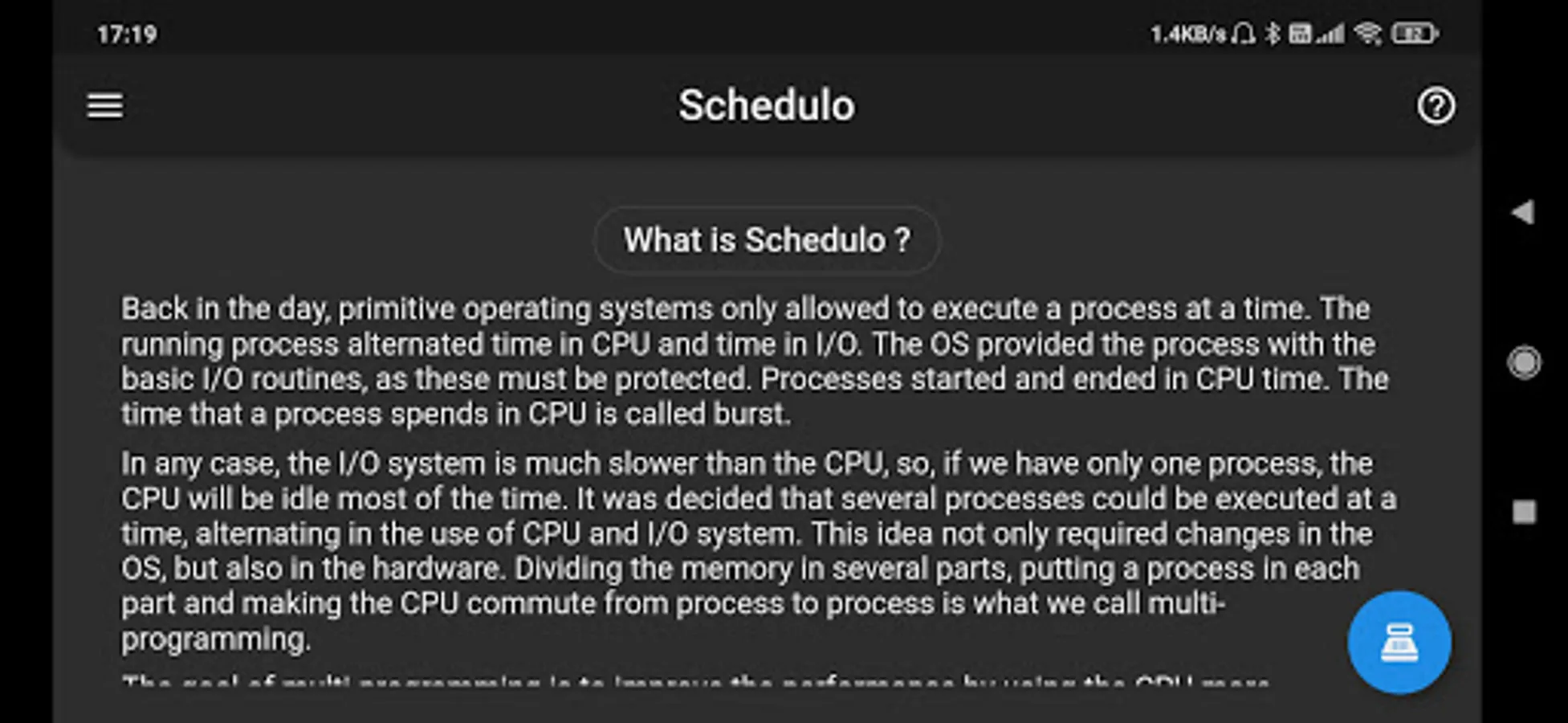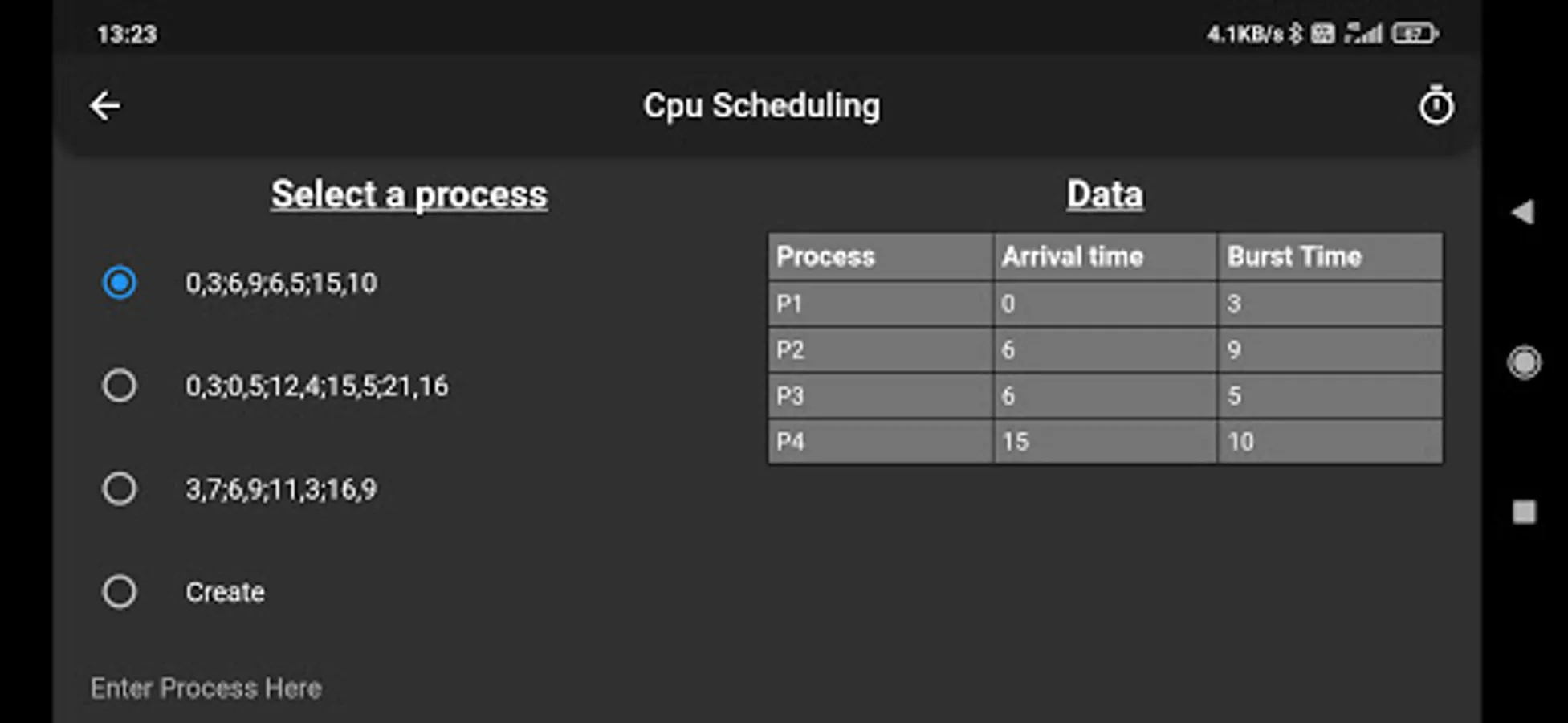 The main function of this app is solving and graphing different CPU Scheduling algorithms. The values plot in a process table and it gives you the algorithm that computes the average waiting and turnaround time.