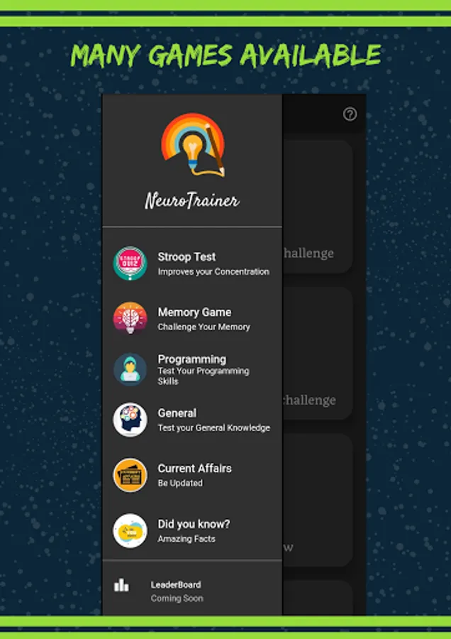 For now application contains 5 brain training games: